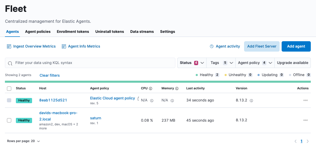 After deploying an Elastic Agent to a host, view details about the agent and inspect the data streams it creates. To learn more about the benefits of using data streams, refer to Data streams.