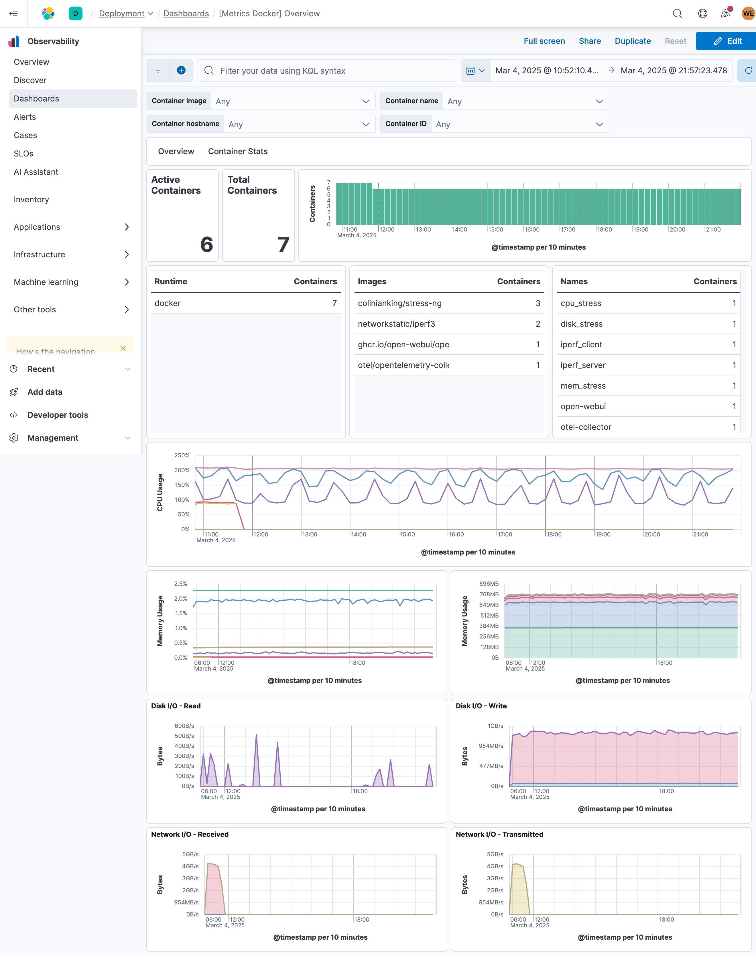 The Docker OpenTelemetry Assets content package provides out-of-the-box dashboards for visualizing container performance and resource utilization metrics such as CPU usage, memory consumption, disk I/O, and network traffic from Docker hosts running OpenTelemetry Collector with the Docker Stats Receiver.