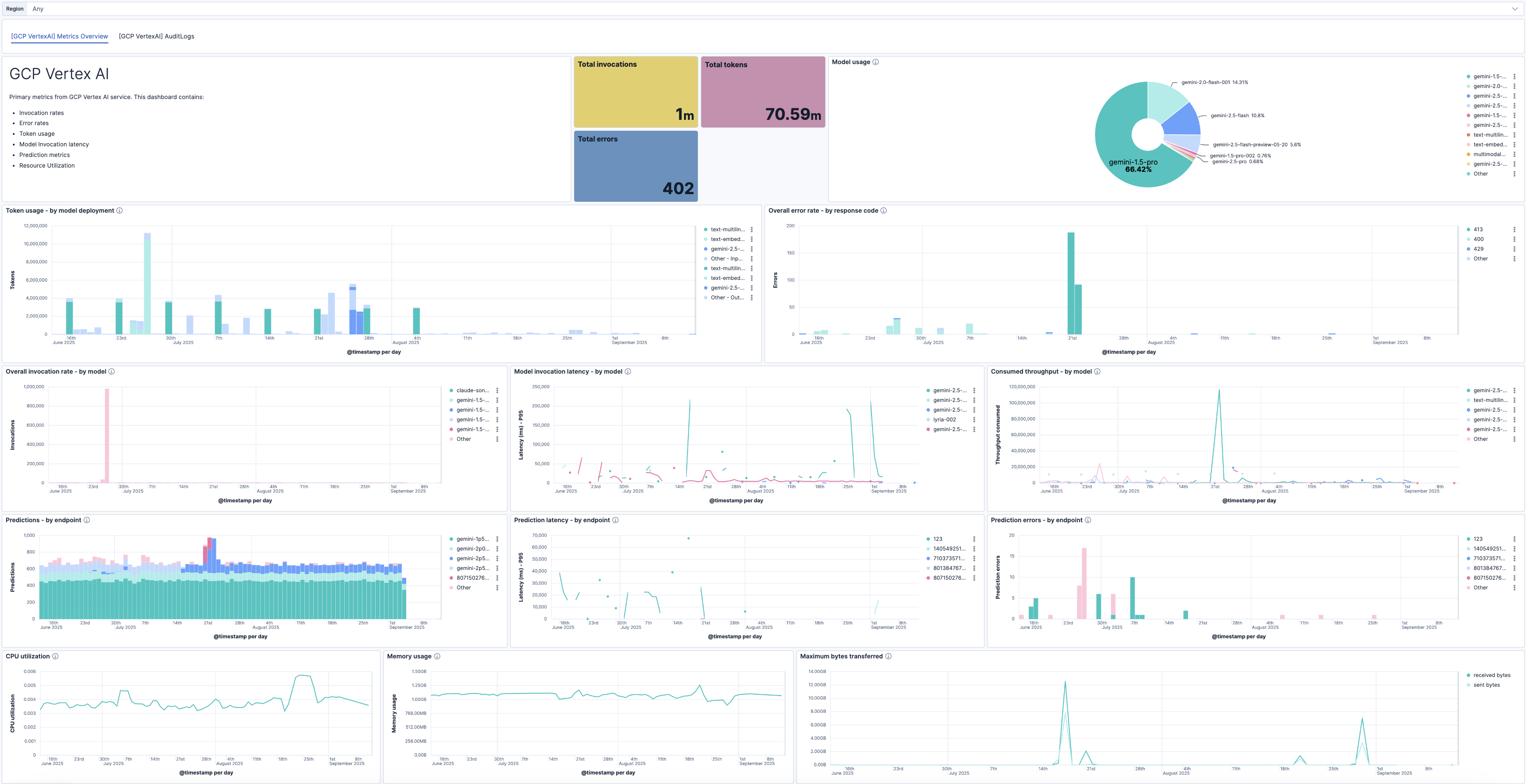 The integration with Google Cloud Platform (GCP) Vertex AI allows you to gather metrics such as token usage, latency, overall invocations, and error rates for deployed models. Additionally, it tracks resource utilization metrics for the model replicas as well as prediction metrics of endpoints.