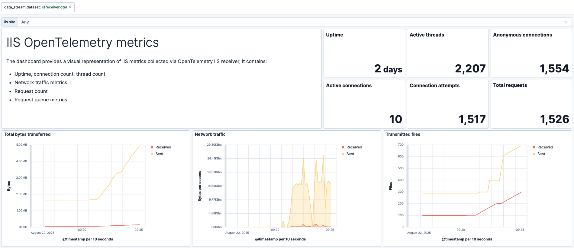 The IIS OpenTelemetry assets provide a visual representation of IIS metrics collected via OpenTelemetry (IIS receiver).