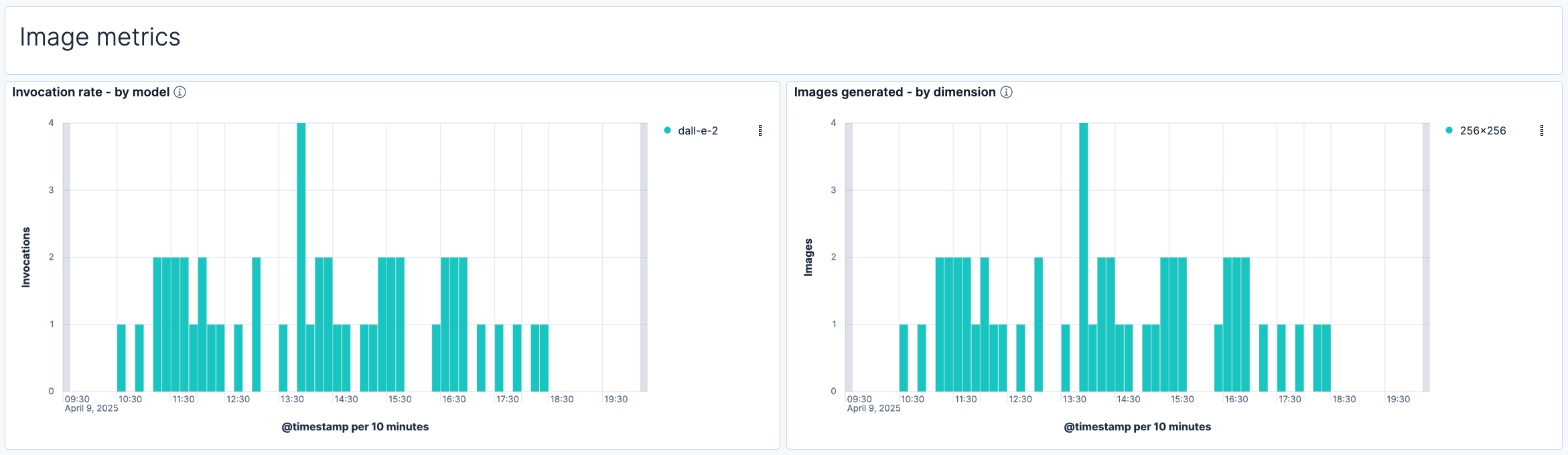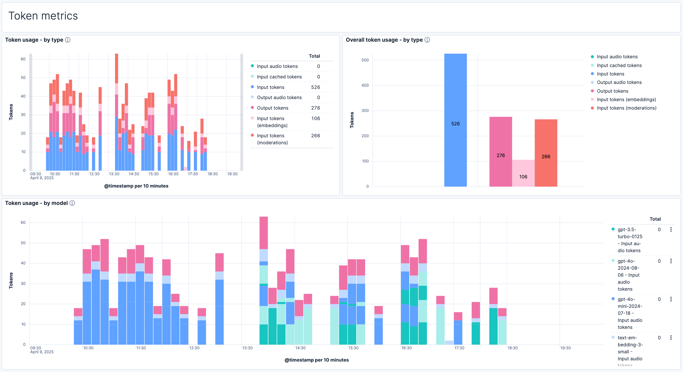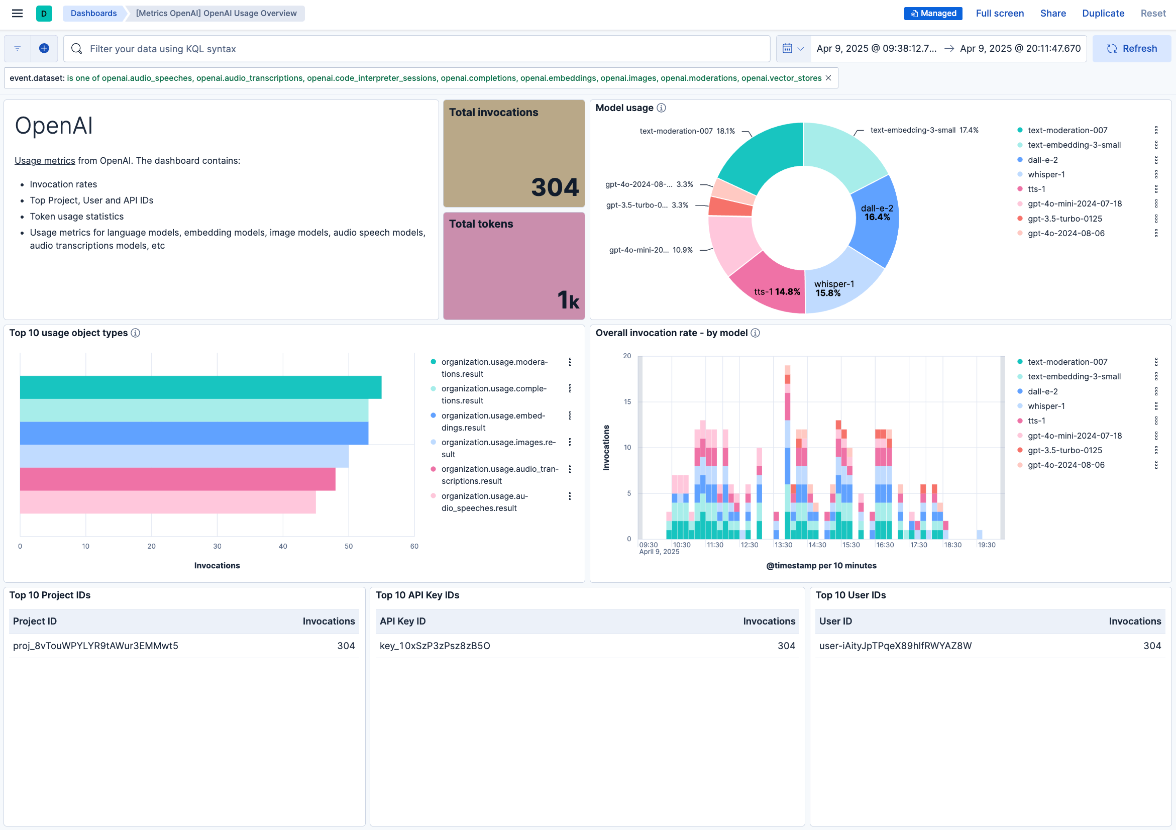 With the OpenAI integration, you can track API usage metrics across their models, as well as for vector store and code interpreter. You will use Kibana to visualize your data, create alerts if usage limits are approaching, and view metrics when you troubleshoot issues. For example, you can track token usage and API calls per model.