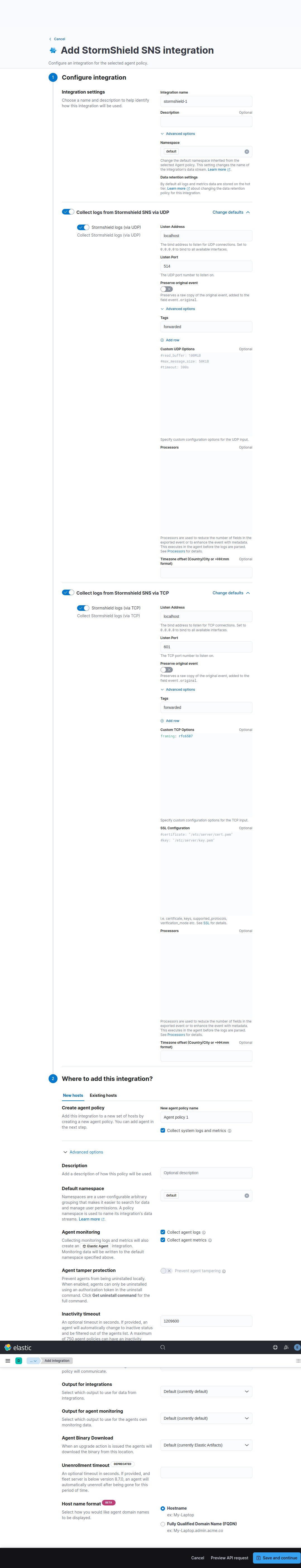 The SNS integration ingests logs via a syslog parser, so the SNS appliance needs to be configured to send syslogs to a listening Agent. This is configured in the CONFIGURATION tab, in the NOTIFICATIONS / LOGS-SYSLOG-IPFIX section. Please review the Stormshield documentation for details on how to configure syslog: https://documentation.stormshield.eu/SNS/v4/en/Content/Description_of_Audit_logs/Configure_logs.htm.