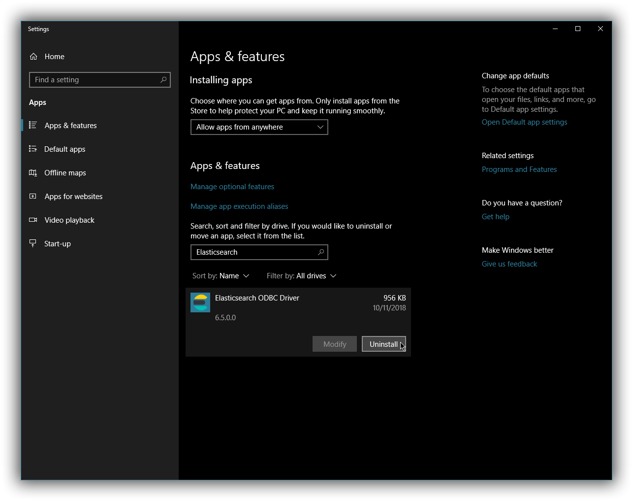 Once opened, find the Elasticsearch ODBC Driver installation within the list of installed applications, click and choose Uninstall: