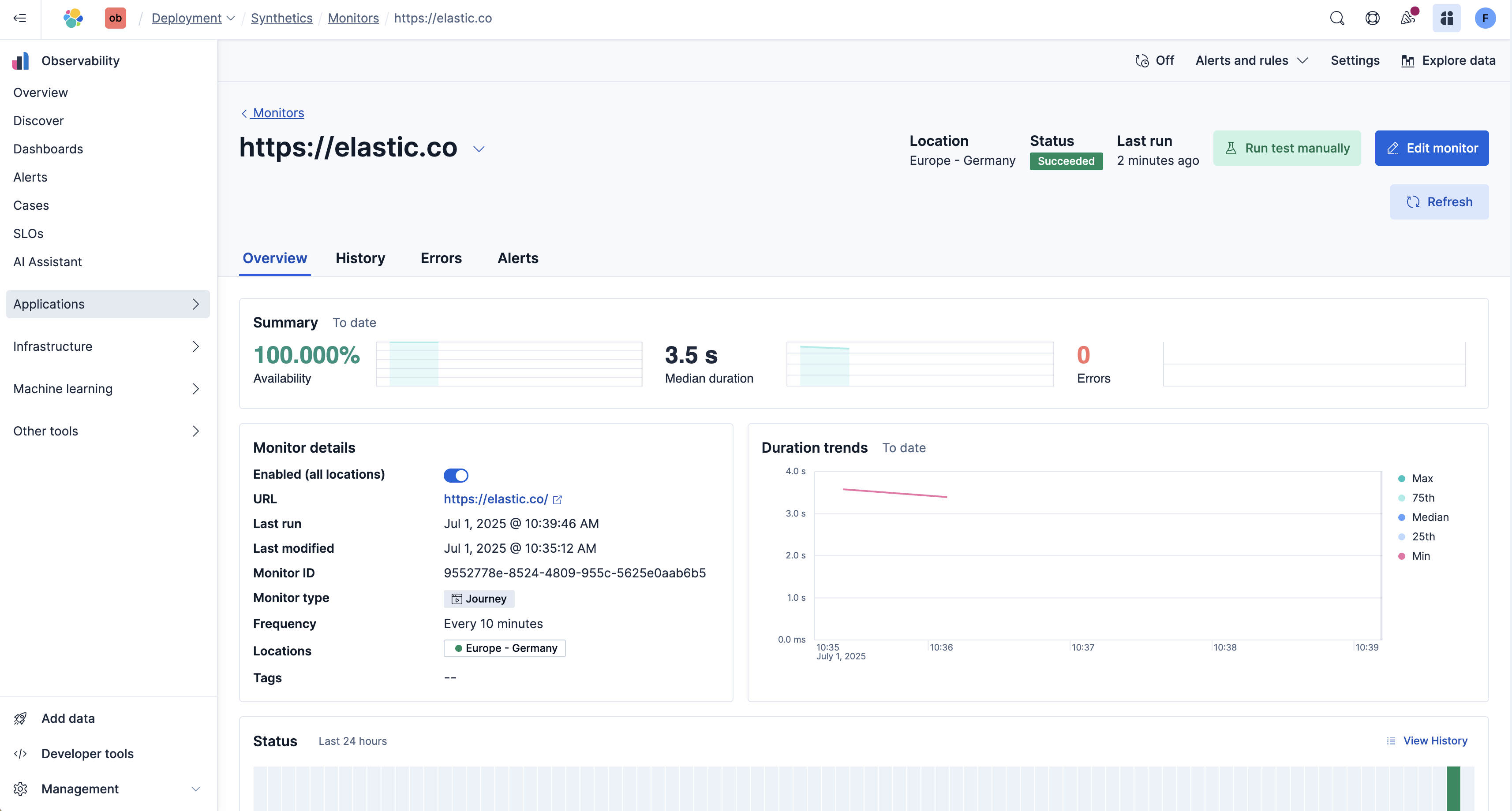 - Elastic's global managed testing infrastructure: With Elastic's global managed testing infrastructure, you can create and run monitors in multiple locations without having to manage your own infrastructure. Elastic takes care of software updates and capacity planning for you. This is perfect for testing websites or applications that are accessible from the public internet.