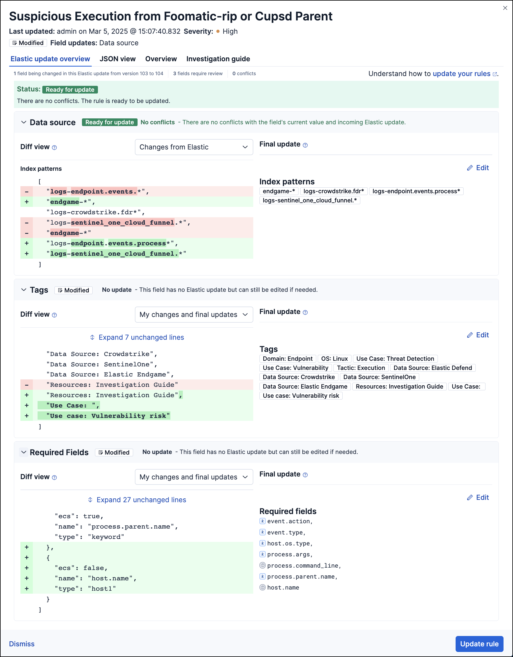 Preview incoming updates: Select the Elastic update overview tab to view rule changes field by field, or the JSON view tab to view changes for the entire rule in JSON format.